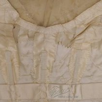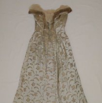One piece, high-waisted, Renaissance-style evening dress with small train. Sea-green silk damask with gold metallic ribbon. Flower and leaf pattern. V-shaped bodice decoration of 3" folded ribbon, golden, sheer. Ribbon extends over shoulders to trim sleeve and extends to waist in back Layered ivory tulle inset at front and back centers Ivory tulle and netting sleeves Three interior stays on bodice sides and front, nine in all. Second layer of silk fabric forms train in back from waist to floor. |