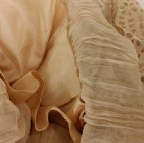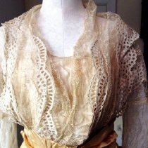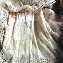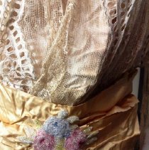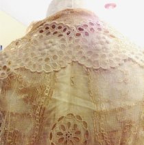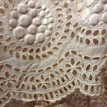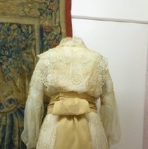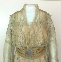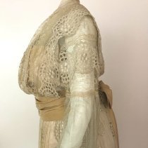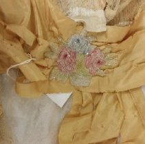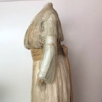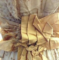 Two-piece, white / ecru summer dress with gold ribbon waist and large beaded flower. Cotton dress has eyelet rosettes throughout. Fox. Bodice: Long sleeves of rosette eyelet and netting with peach ribbon and covered buttons at cuff. 5" wide folded ribbon belt with seed bead flower basket decoration center front. Knot with single drape center back. Rosette eyelet and netting shawl front. Bodice lined with peach silk. Skirt: cotton eyelet of rosette pattern (2", 3", and 5" in diameter). Vertical netting inset, full length on left front. Skirt lined with peach silk. 5" rosettes at hem are embroidered with satin stitching, three layers at hem-two with eyelet and netting, one with lining and eyelet at hem. 2018 Conserved by ConText 2018 Spring exhibited |